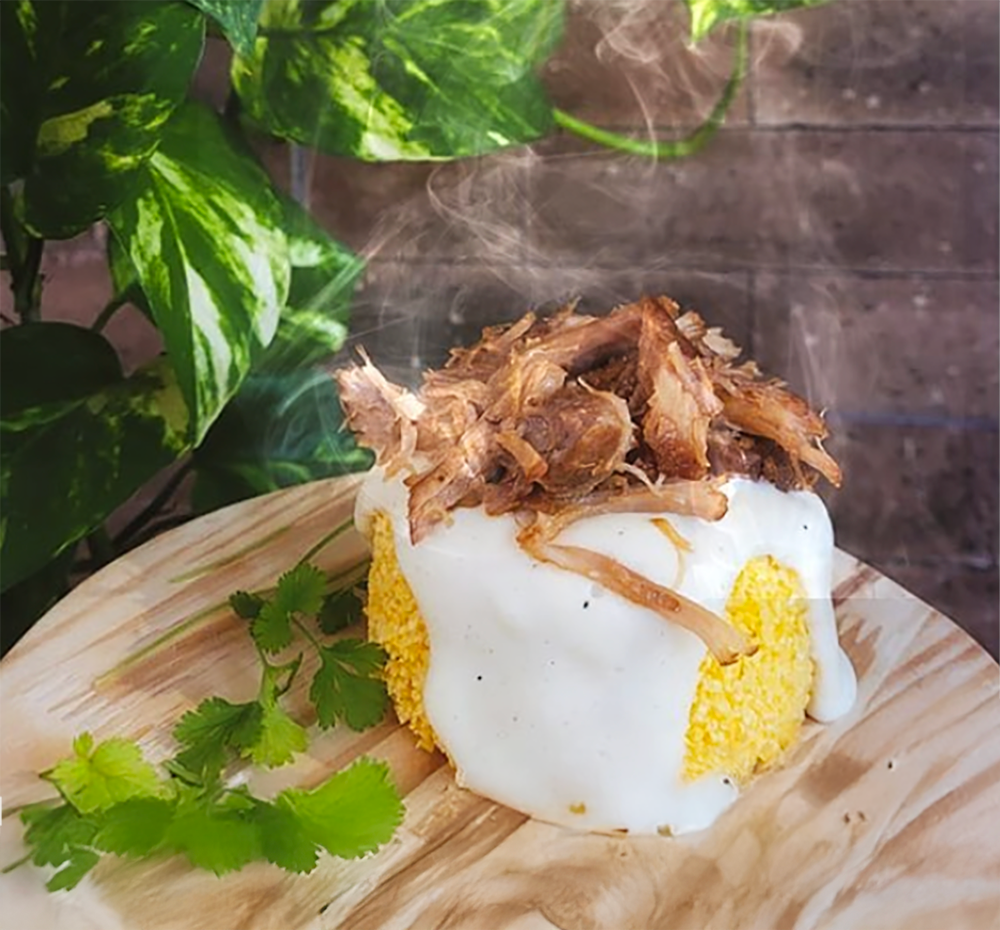 Cuscuz de Flocão com molho de queijo e pernil desfiado