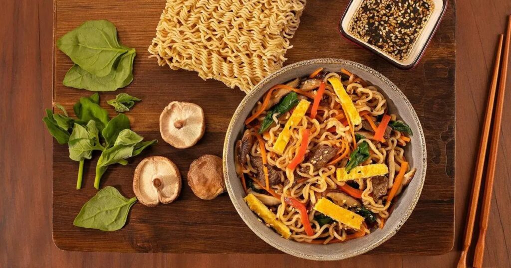 – Junte o macarrão lámen e cozinhe de acordo com as instruções da embalagem – cerca de 3 minutos.