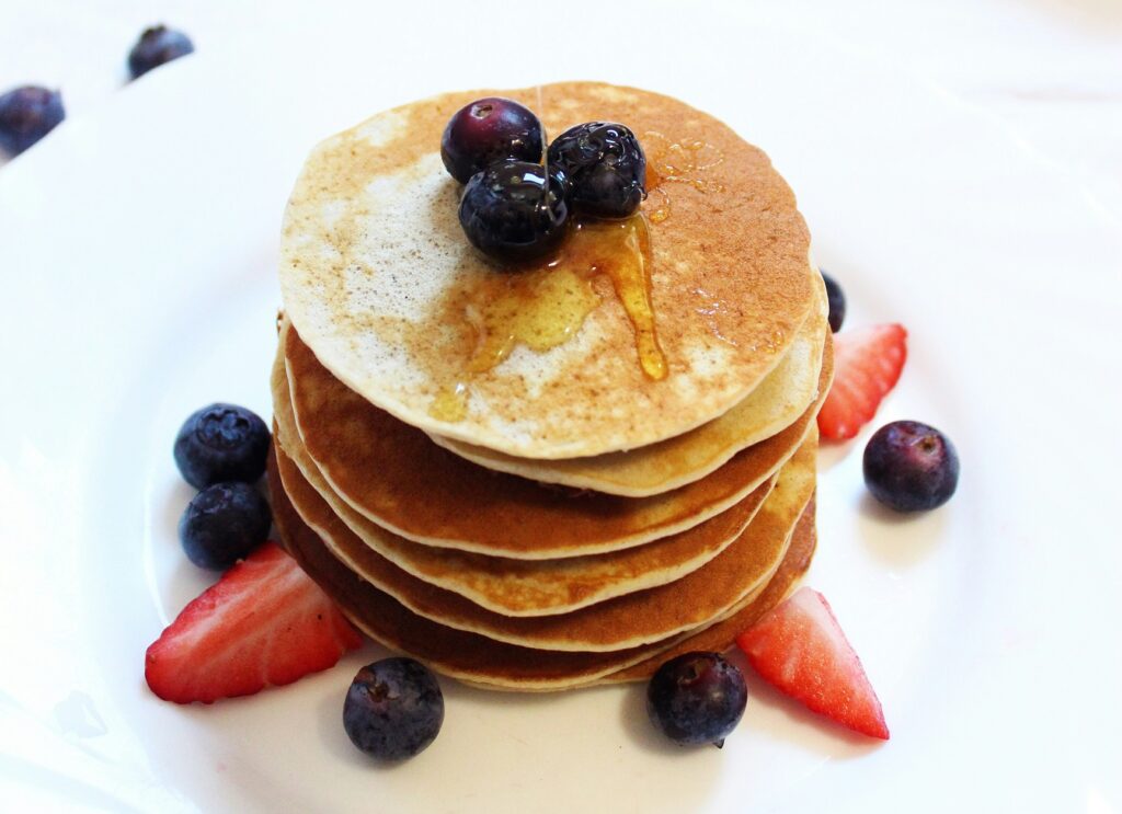Versátil, essa panqueca pode ser servida com frutas, castanhas ou geleias naturais. Rica em fibras e energia.